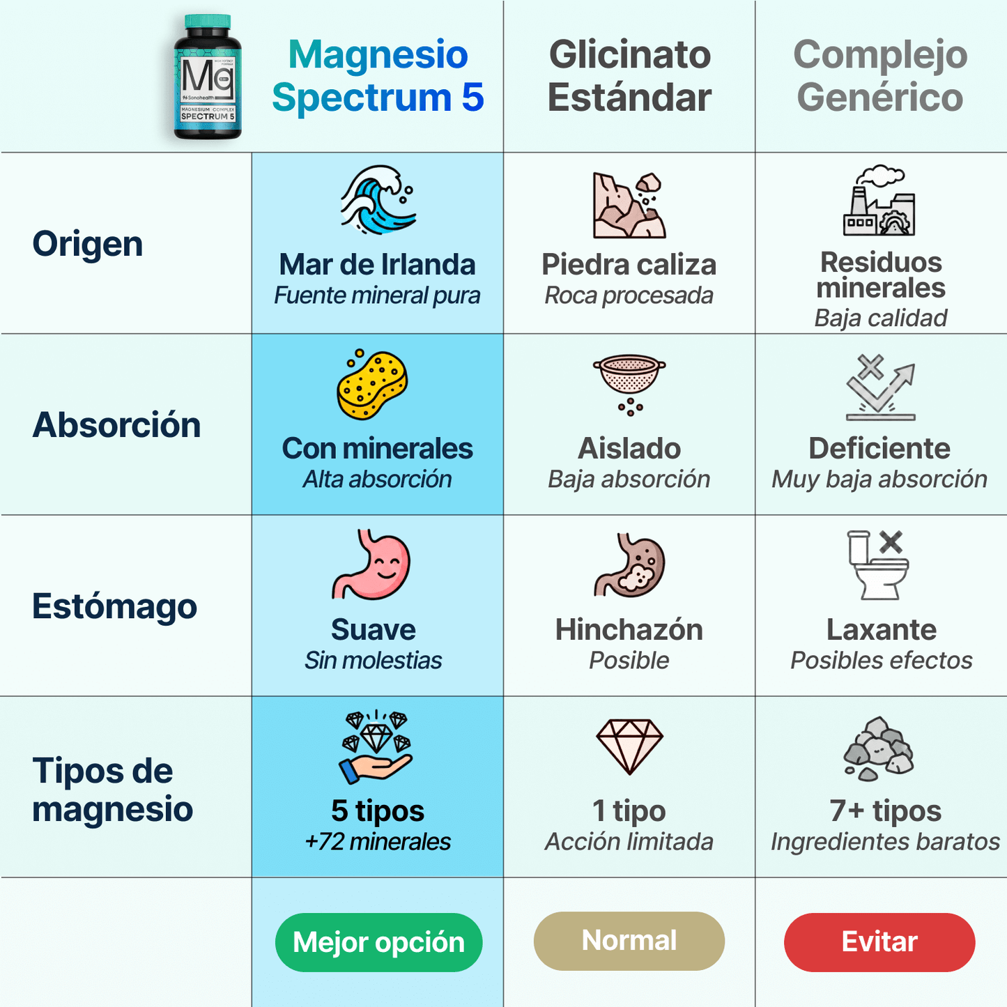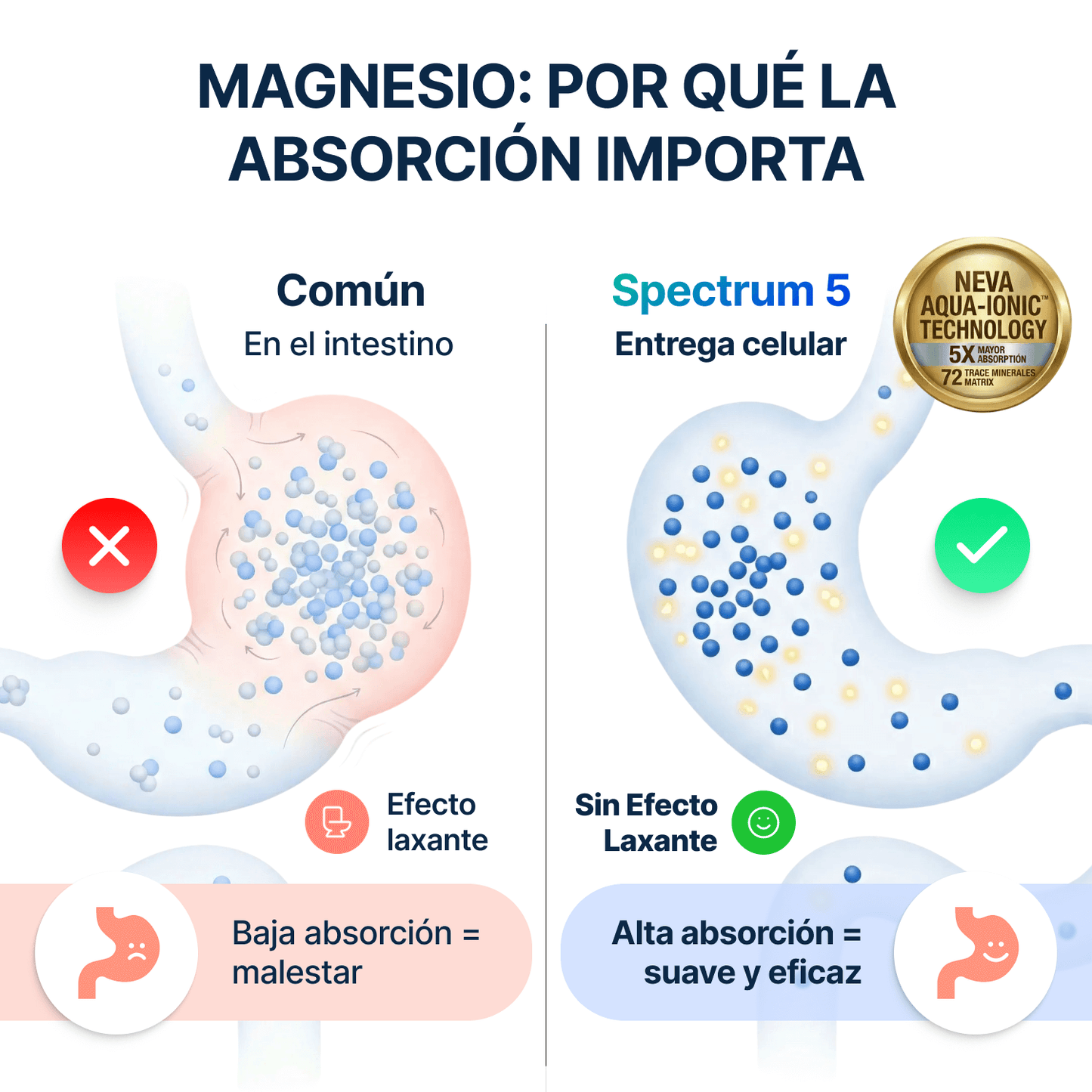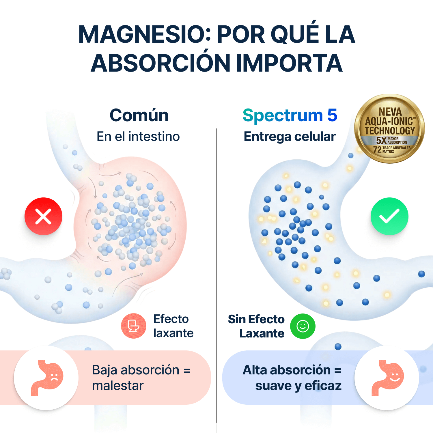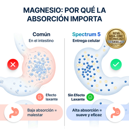 Algunas personas pueden experimentar cambios digestivos leves al comenzar a tomar un suplemento de magnesio, ya que este favorece la motilidad intestinal de forma natural y puede tener un ligero efecto suavizante de las heces. Sin embargo, la dosis de Spectrum 5 Magnesium está diseñada para un aporte diario equilibrado, y en la mayoría de las personas no debería causar diarrea si se toma según las indicaciones.