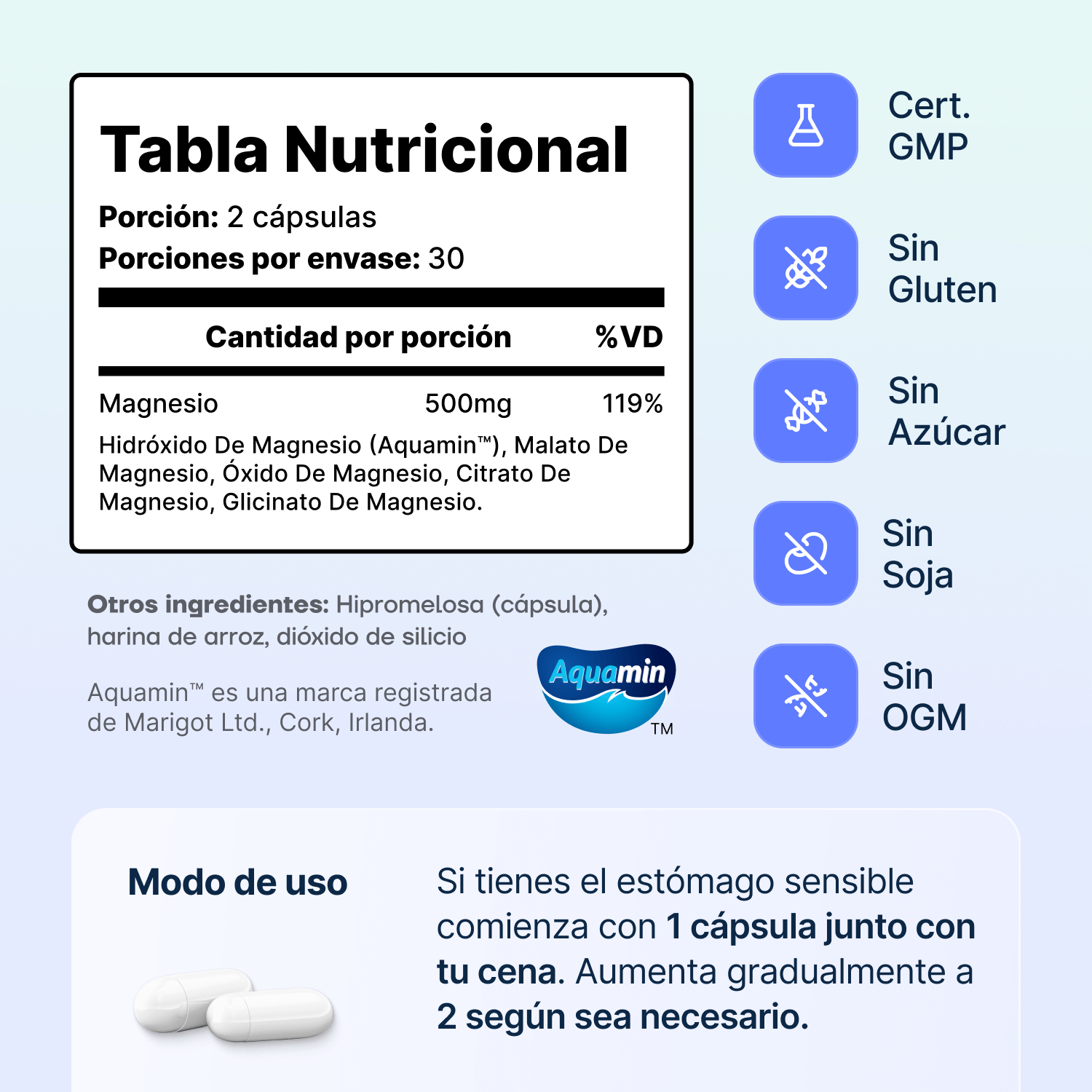 La tolerancia individual puede variar, por lo que tomarlo con alimentos y mantener la dosis recomendada contribuye a una digestión saludable. Si tiene sensibilidad al magnesio o ya toma otros productos con altas dosis de magnesio, puede ser útil ajustar la frecuencia de administración o consultar con un profesional de la salud.